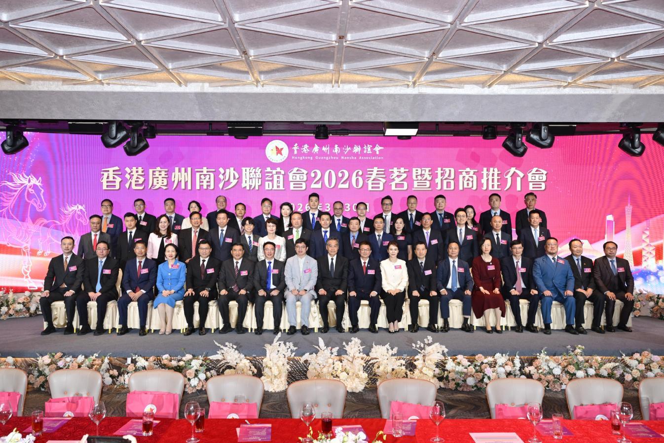 3月30日,香港广州南沙联谊会2026年春茗暨招商推介会在香港举办。全国政协副主席梁振英,广州市委常委、南沙区委书记刘炜,中央政府驻港联络办、香港特区政府有关部门和广州市、南沙区相关单位负责人,全国政协委员、香港立法会委员代表,南沙新区香港服务中心首席联络官、联谊会会员、各界友好社团代表,以及香港企业、商协会、高校等组织机构代表和有关重要代表人士等300余人齐聚一堂,共叙桑梓情谊,共谋合作新篇,共商发展大计。